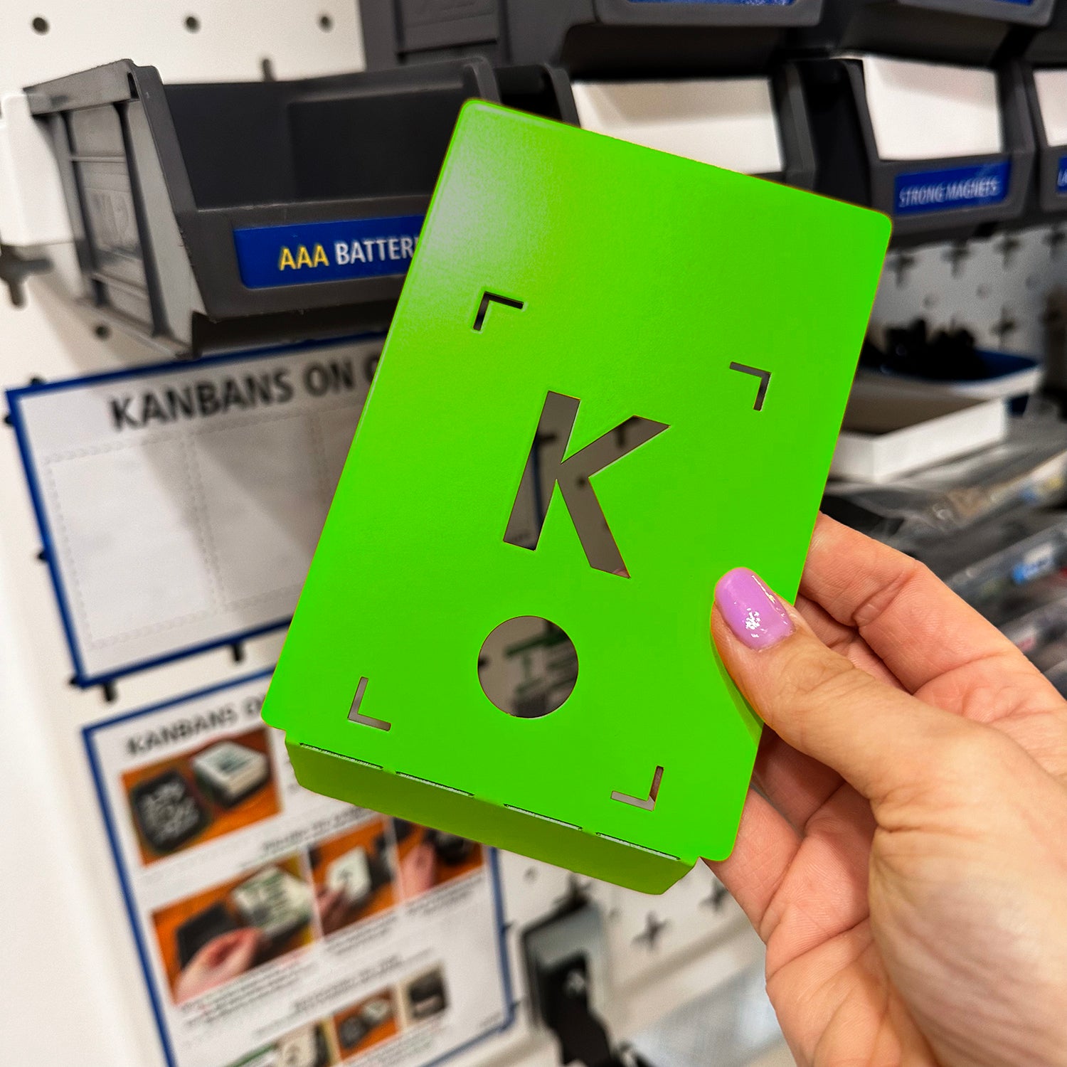 Have you ever run out of an item you need and not only has it been annoying, it has cost you money? Whether that be having to pay express shipping to get the goods to you quicker, or business lost from fulfilment issues. The basic idea of a Kanban is that it signals when you should buy something. Put the kanban and the physical barrier on top of the final 10 of something for instance, and you'll order more when you have only 10 left.