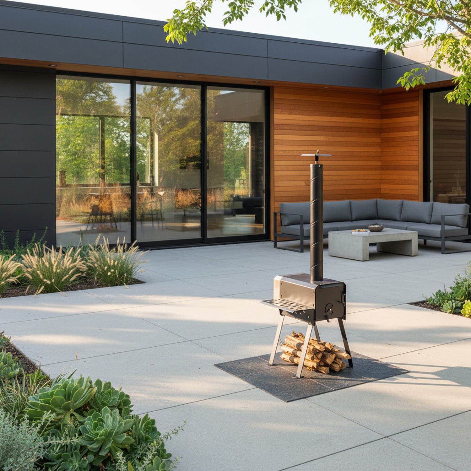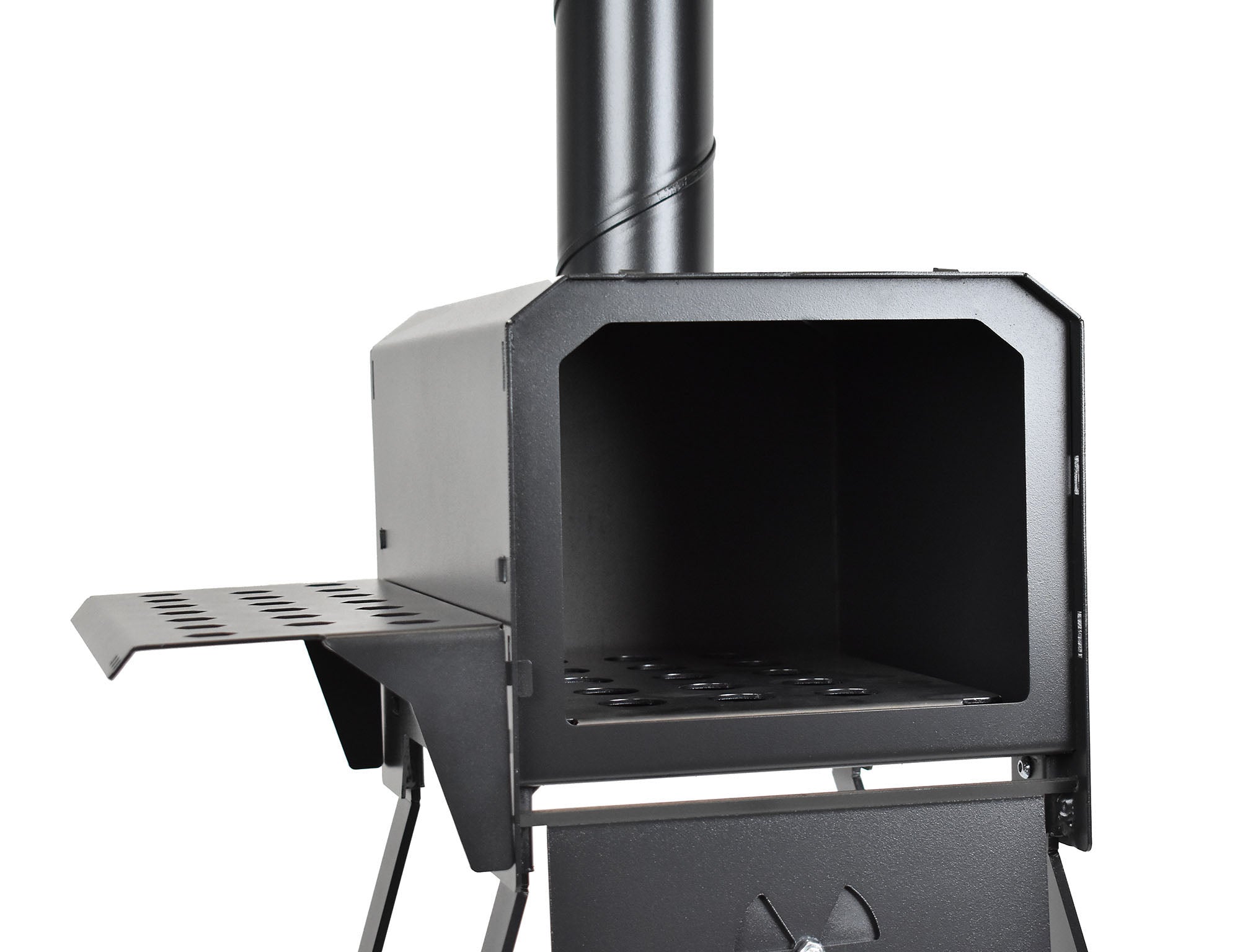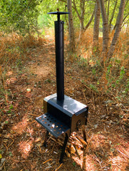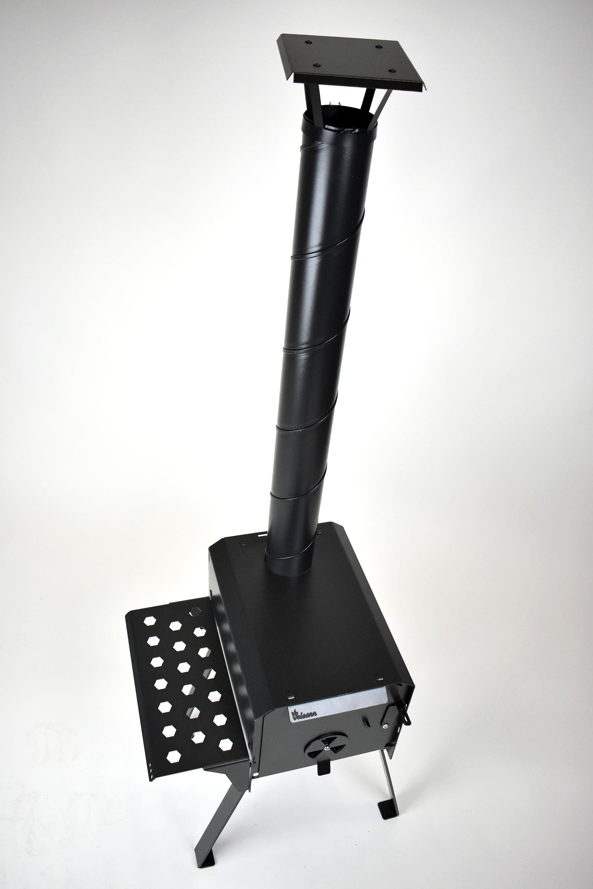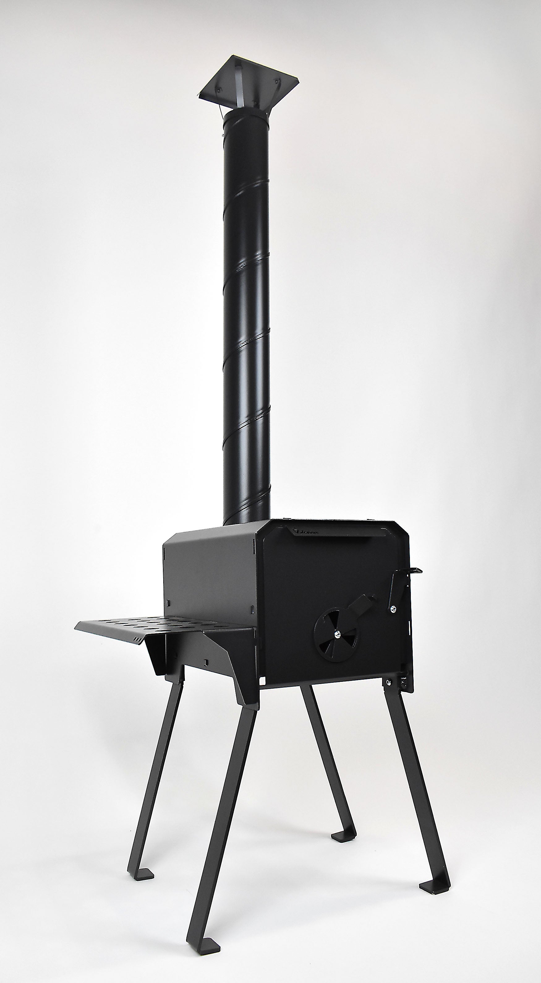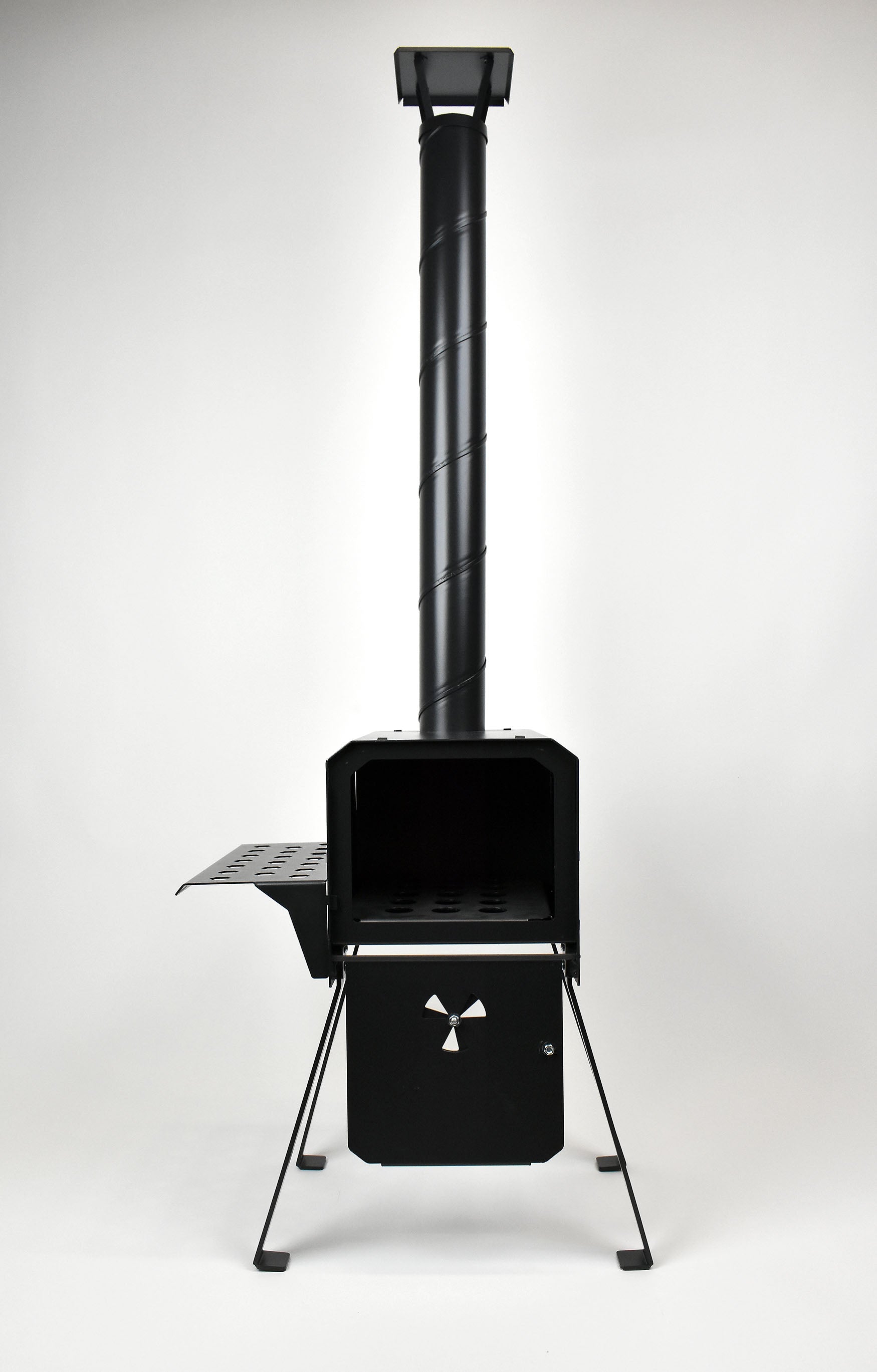 Airflow into the chamber is controlled using a small disc on the door, allowing you to adjust the temperature to suit your cooking or heating needs. Made from durable British steel and finished in a high-temperature resistant black coating, this portable stove is designed to withstand heat, weather, and regular use for many years to come. Each one is made by hand in the UK at our factory and built for real outdoor use.