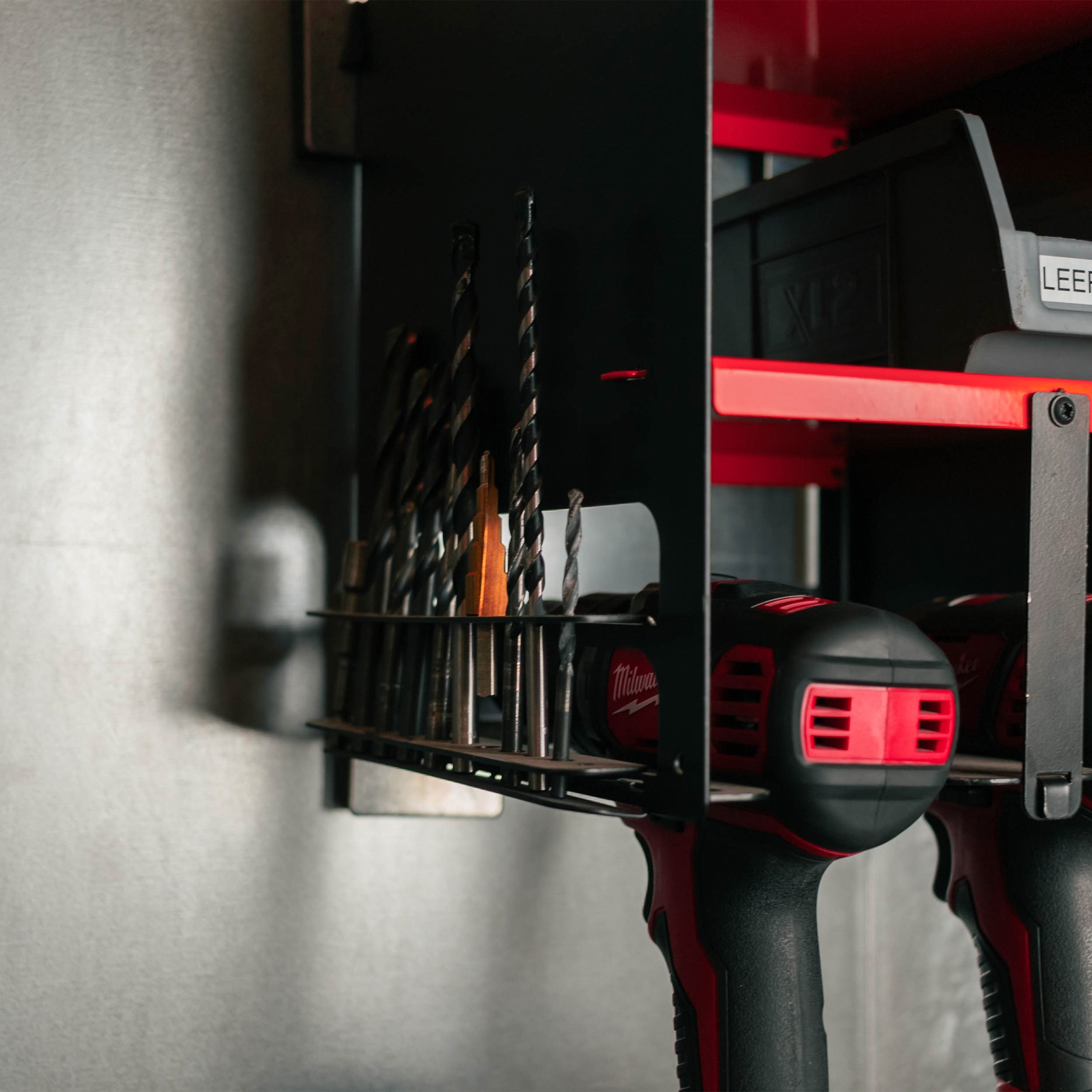 The storage unit provides a great way of storing up to 2 drills. The top and middle shelves allow you to store and charge your tools. You can keep chargers, cables and attachments here. Other tools such as tape measures and hand tools can be kept on the shelves too. On one side of the unit, there are small tabs which can be folded out by hand. These provide ample storage for drill bits and driver bits.