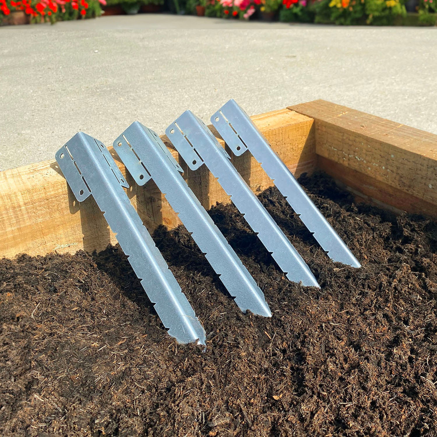 To install, you must simply bang the stake into the ground where the sleeper is to be installed. We recommend a rubber mallet for this. Then just screw the bracket onto the timber sleepers. This can be at the straight joint or on a corner.