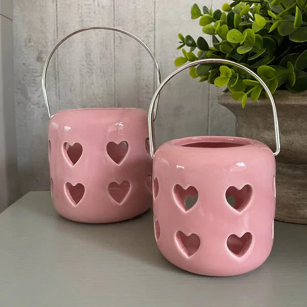 Add a touch of charm and warmth to your home with the Pretty Pink Heart Tealight Lantern. This adorable pink tealight holder features cut-out heart decals, making it the perfect decorative accent for creating a cosy and inviting atmosphere in any room. Whether used as a functional lantern to hold a tealight or as a charming decorative piece, this sweet ceramic lantern will instantly brighten your living space.