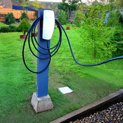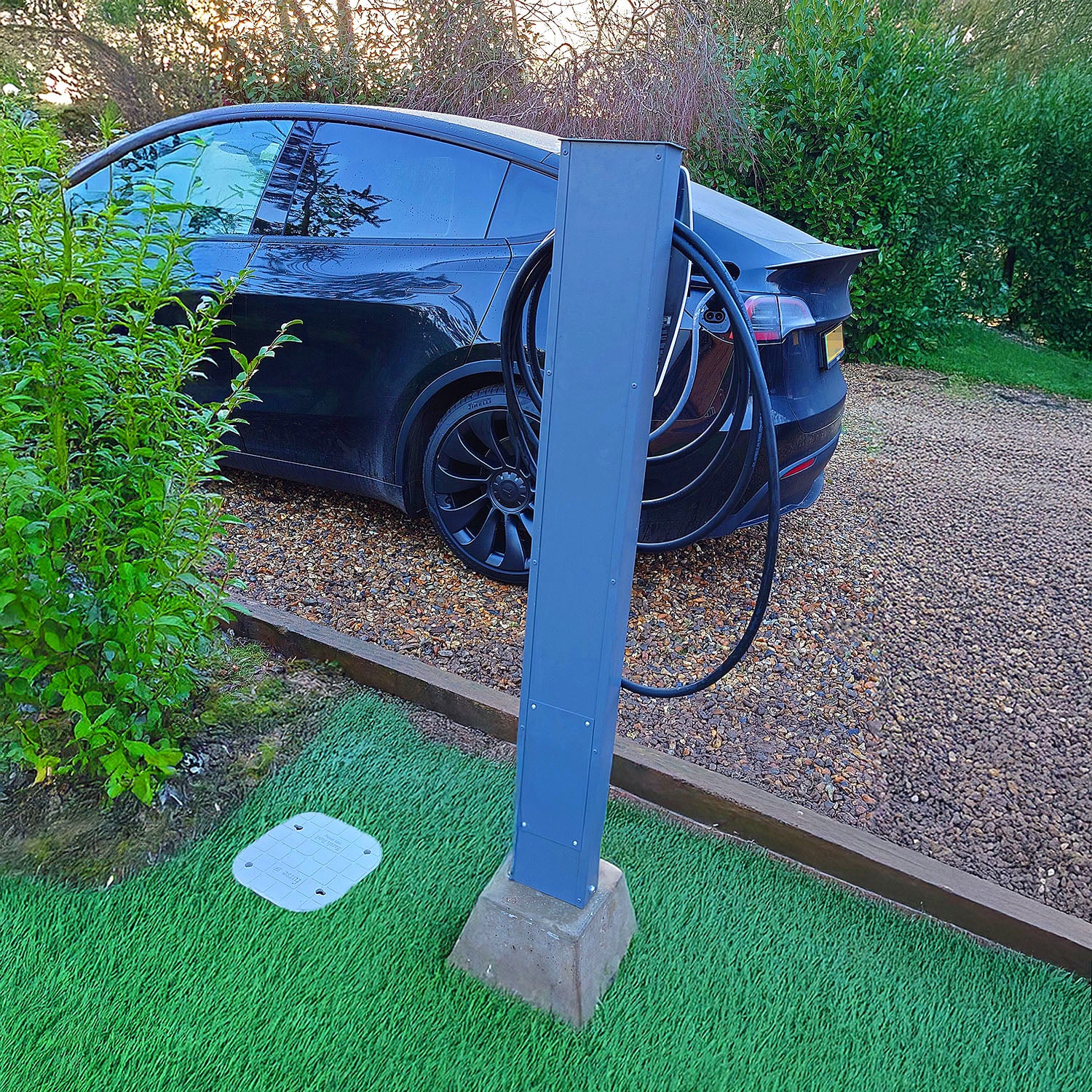The cables can be installed to drop through the Tesla Wall Connector Pedestal, with the top panel ensuring that the cables are protected from rain and weather. The cables can drop through and then be installed directly into the ground through trenching, or through one of our unique concrete base mounts.