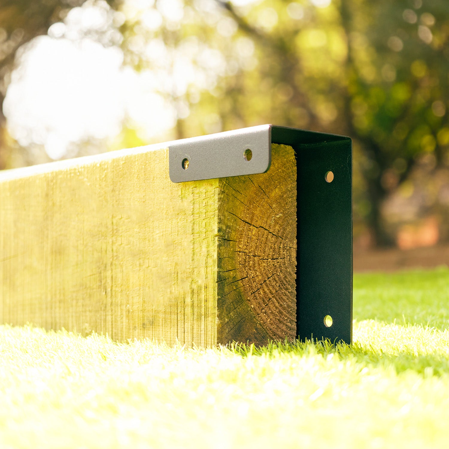To install, simply align the bracket over the join between two railway sleepers. The larger face of the bracket sits flat across the joint, and the shorter top flange rests on the horizontal face of the sleeper. Use screws to fix the bracket in place. This bracket is suitable for use with a wide range of timber sizes and can be installed with basic tools in just a few minutes.