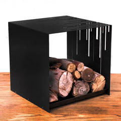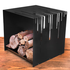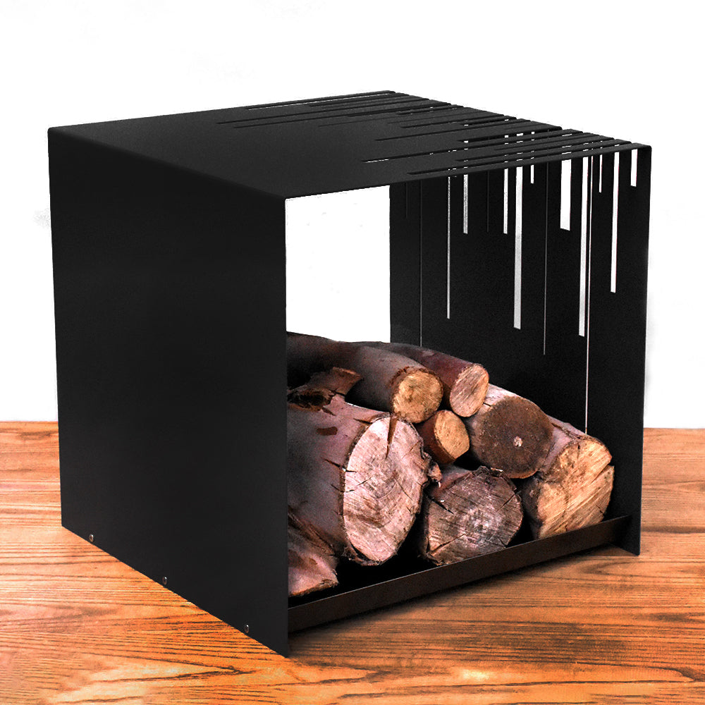 This particular design is inspired by the Cubist art movement. There are lines cut out of the side in various sizes and thicknesses. This gives the log basket a fully unique look. The lip on the edge of the log basket ensures the bottom logs cannot fall out or be knocked off the edge. There is no back to this log basket, however there is a top, allowing this to double-up as a side table.